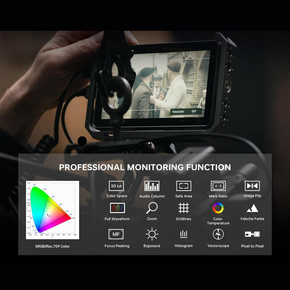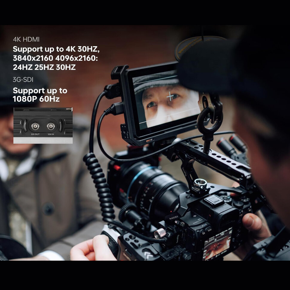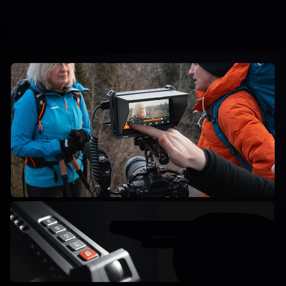 Для любых целей и задачКрепление монитора осуществляется с помощью адаптера для горячего башмака. В комплект также входит козырек, который защищает экран от бликов, обеспечивая отличную видимость в яркий солнечный день. С яркостью 2000 cd/m² и инструментами анализа изображения, такими как гистограмма и вектороскоп, такой монитор подойдет как для студийной, так и для полевой съемки |