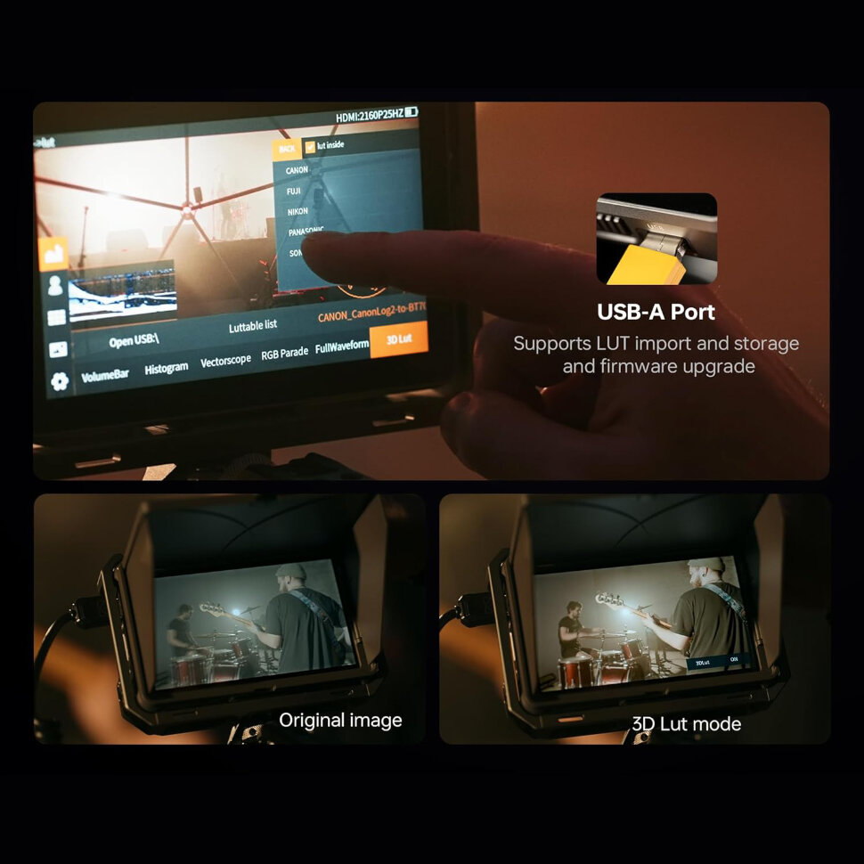 Продуманная конструкцияОбновлять прошивку или загружать пользовательские 3D LUT файлы можно через слот для SD-карт или USB-порт, что добавляет гибкости в настройке изображения. Монитор питается от аккумулятора NP-F или посредством адаптера питания через Type-C или DC |