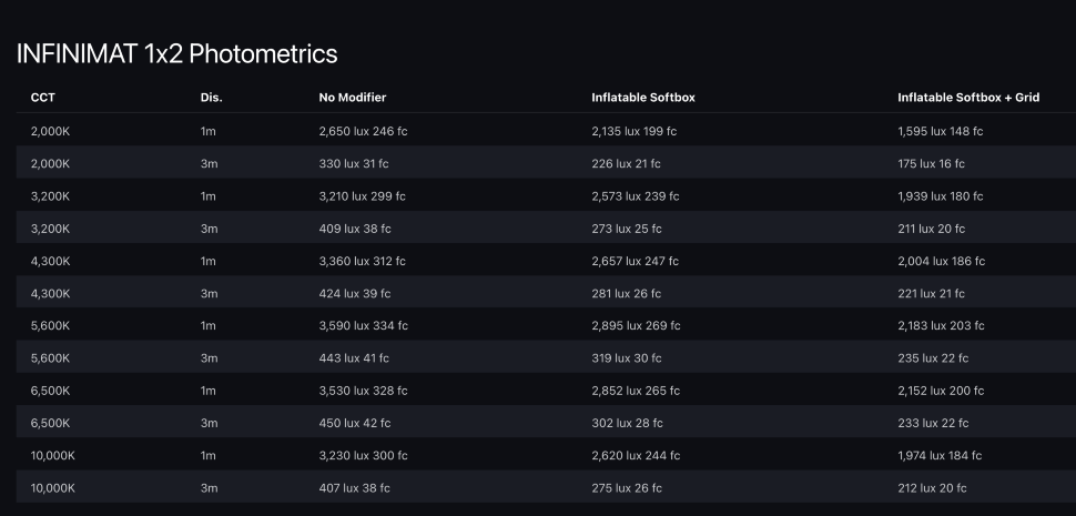 INFINIMAT — это высокофункциональные RGBWW панели в нескольких вариантах габаритов. Модульный дизайн позволяет адаптироваться к различным съёмочным ситуациям, получая наилучшее освещение. Осветитель имеет конструкцию надувной панели, а значит свет получается мягким, словно при использовании софтбокса. Также предусмотрена возможность установки сот и юбки, что позволяет гибко контролировать угол луча и резкость теней. Размер пикселя в больших панелях может быть 1x2 или 2x2 для получения нескольких цветов в пределах одного осветителя |
