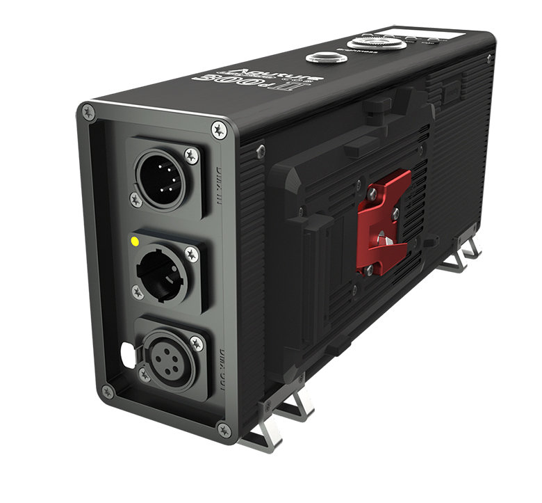Внешний блок питанияПомимо уже описанных изменений, полное переосмысление получил и блок питания и управления, что значительно снижает вес моноблока, и делает работу со светом гораздо удобнее. При помощи специального крепления, блок можно установить на стойке, и уже туда поставить массивными аккумуляторы V-mount. На торце расположены органы управления, а также дисплей, с помощью которого вы можете регулировать настройки и следить за уровнем батареи |