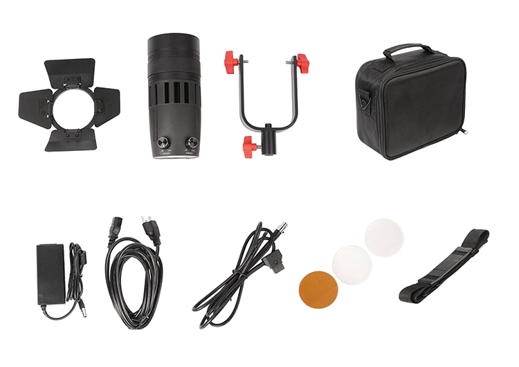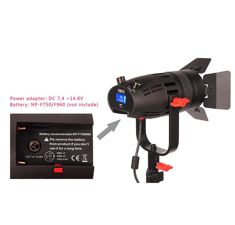 | Прожектор может быть подключен непосредственно к сети при помощи сетевого адаптера, либо питаться от батареи типа NP-F или V-Mount |