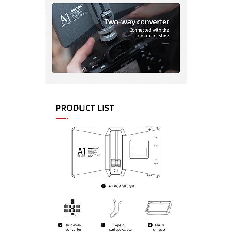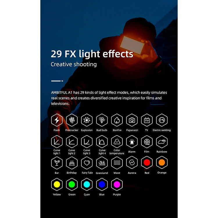 A1 имеет 60 RGB диодов, что позволяет настраивать свет практически любого оттенка, а также применять FX режимы, что поможет получить необычные эффекты в видео |