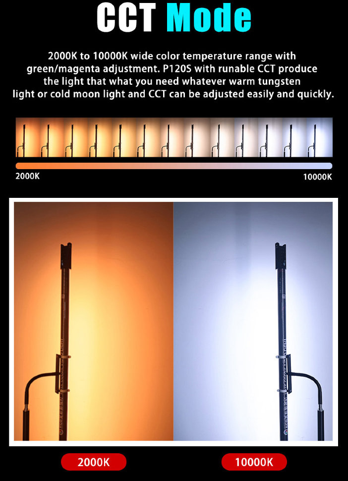 P120S - это универсальный RGB осветитель с гибкими настройками, что предлагает широкий спектр возможностей для профессиональных фотографов, видеографов и создателей контента. Модель имеет диапазон цветовой температуры от 2000 до 10 000K, что позволяет создавать любые световые эффекты под самое разное настроение или сцену |