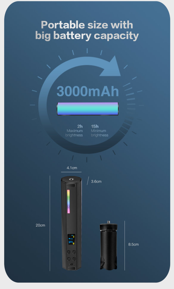 АвтономныйЖезл имеет встроенный аккумулятор, ёмкости которого хватит на целых 15 часов работы при минимальной мощности, а на максимальных настройках около 2-х часов. Пополнить заряд можно при помощи Type-C кабеля |