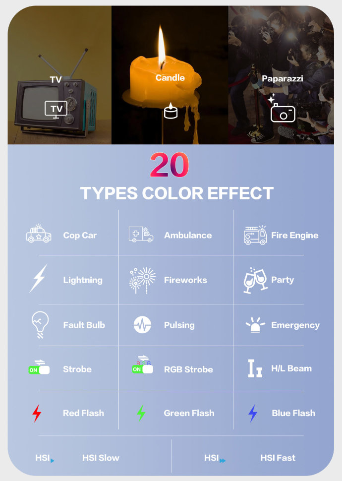 | FX режимы | Ambulance, Cop car/Police, Emergency, Faulty bulb/Bad bulb, Fire truck, Fireworks, Flash, Lightning, Party, Pulsing/Pulse, RGB Strobe, Strobe |