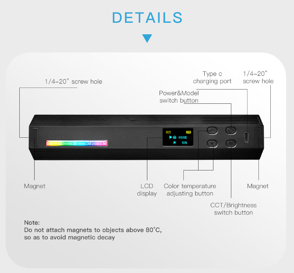 Маленький, но яркийКомпактный RGB жезл для профессиональной и любительской съёмки. Осветитель длиной всего 20 см выдаёт 7 Вт мощности. Имеет 69 теплых светодиодов, 69 холодных и 46 многоцветных. Новинка имеет 20 художественных режимов работы для особых эффектов на видео |