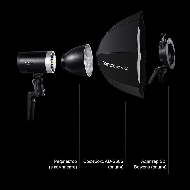КомпактностьПортативный осветитель легко удерживать в руке, он имеет небольшой вес. При своих компактных размерах он характеризуется превосходной производительностью и надежностью. Осветитель совместим с креплениями Godox. Если использовать адаптер S2, то можно установить аксессуары, которые совместимы с креплением Bowens |