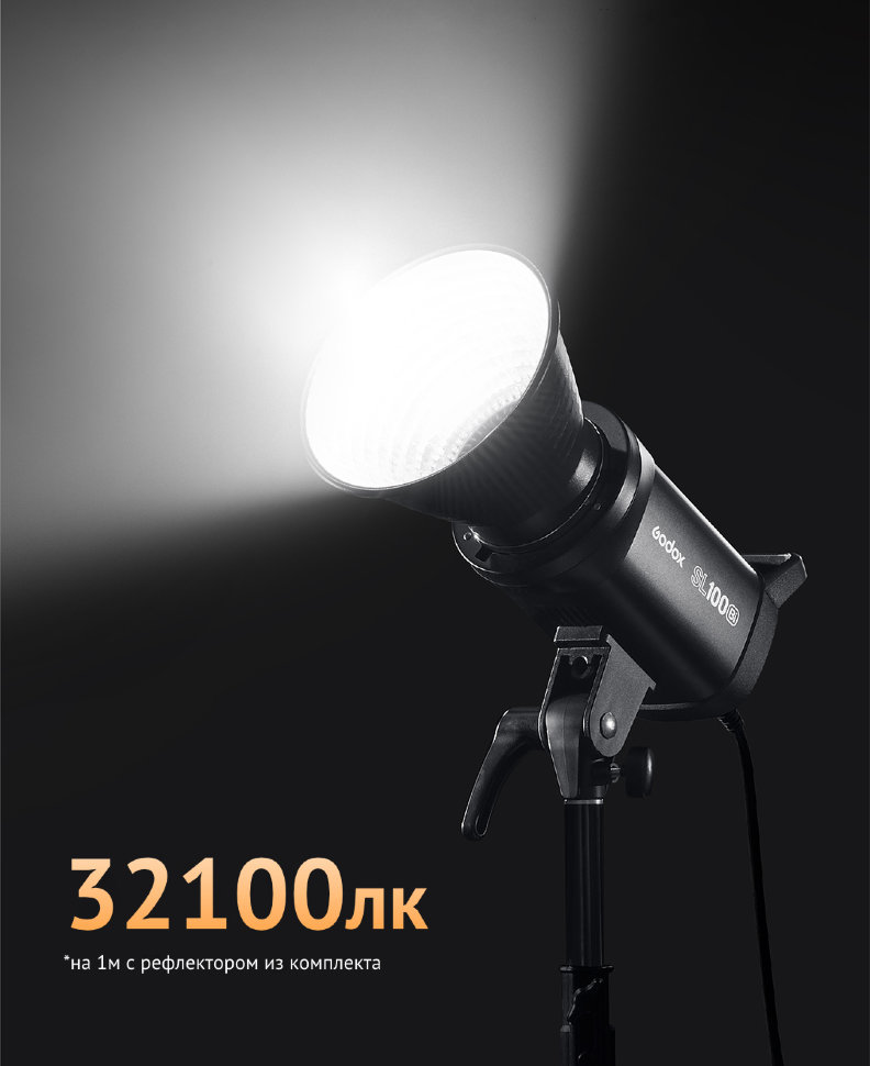 Студийный моноблок с максимальной мощностью в 100 Вт. Яркость регулируется в пределах от 0 до 100%. Максимальная освещенность на 1 метр составляет 32100 Люкс. Прекрасный вариант для съемки видео на YouTube, короткометражных рекламных роликов, художественной замедленной съемки |