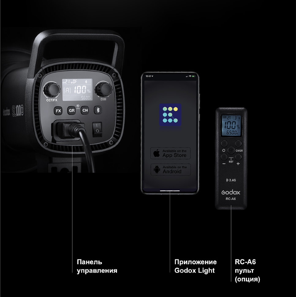 | Способ управления | панель управления на корпусе, приложение Godox Light app |