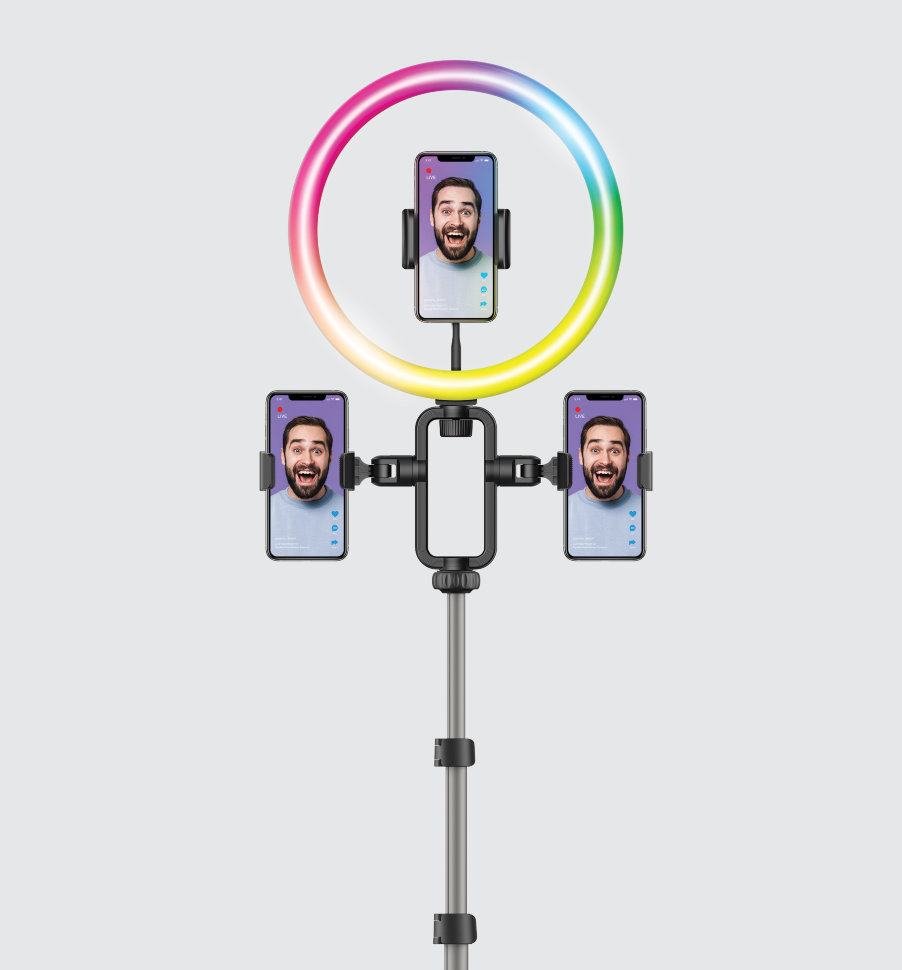 Мощная подсветкаДержатель для телефона со светодиодным кольцом, с возможностью настройки яркости, цветовой температуры и RGB-режимом, станет незаменимым аксессуаром для создания видеоконтента. Аксессуар оборудован 12-дюймовым кольцом, под которым установлено 160 светодиодов, со световым потоком от 500 до 700 лм. Такой мощный аксессуар гарантирует вам не только улучшение качества, но и возможность привлечения внимания к контенту |