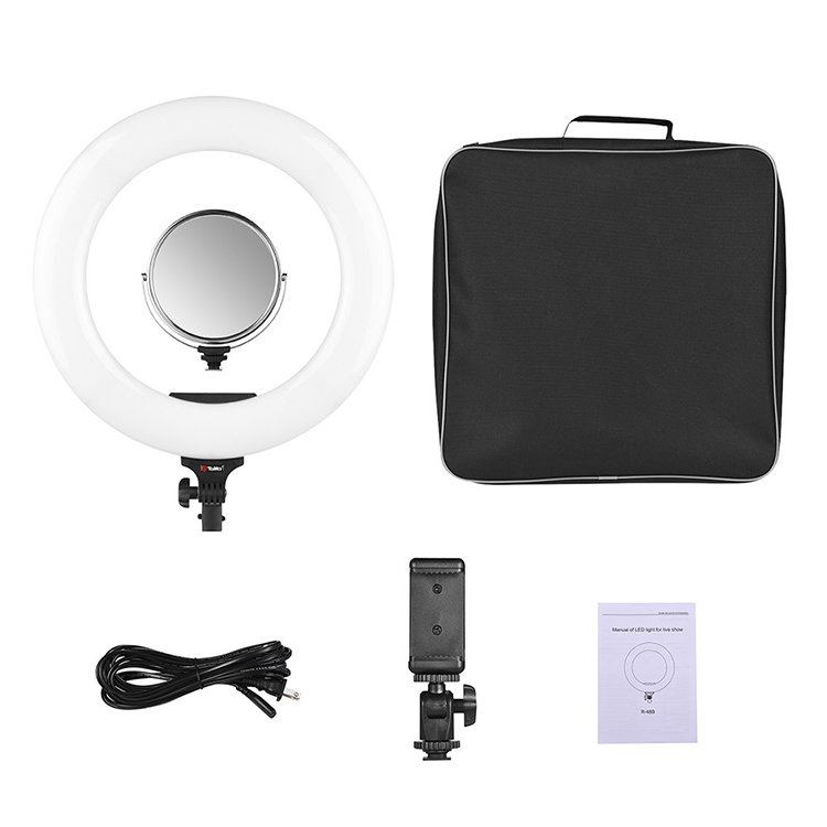 | R-40B Lite включает в себя не только кольцевую лампу, но и все необходимое для бьюти-блога или профессионального макияжа. Помимо стойки для студийной съёмки, вы найдете в комплекте зеркало на 6 дюймов, держатель для смартфона и крепление типа холодный башмак, благодаря чему вы сможете создать свою домашнюю видео студию. Переносить лампу будет удобно в надежном транспортировочном чехле |