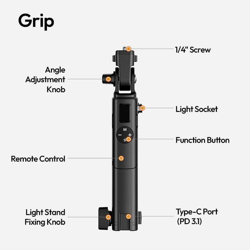 | Способ управления | панель управления на рукоятке, приложение Ulanzi Connect app, съёмный пульт Д/У |