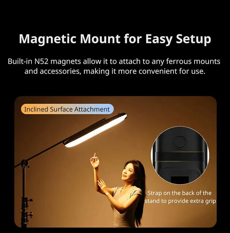 Разные варианты установкиДля установки вы сможете использовать не только стойки, для которых в комплекте поставляется адаптер с резьбой 1/4", но и металлические поверхности, на которые осветитель крепится с помощью встроенных магнитов, или же воспользоваться ремешком для подвеса |