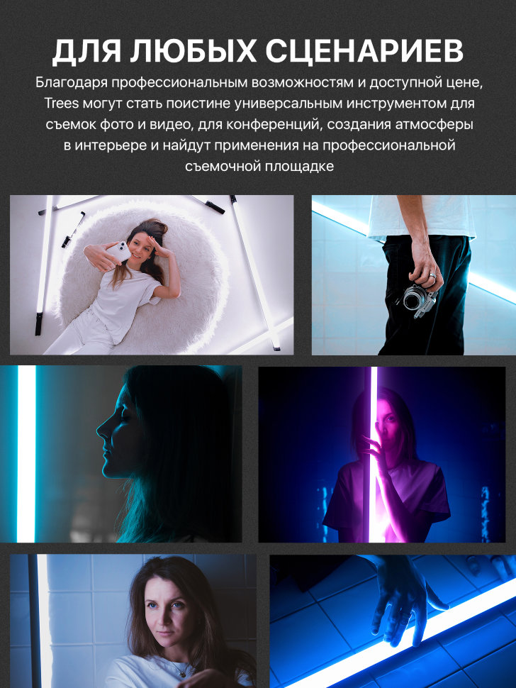 Для любых сценариевОбновленная линейка REQUIRED Trees обзавелась адресными диодами, что позволяет получать на одном жезле несколько цветов и создавать градиенты! В серии представлены 3 типоразмера: Sakura - 28см, Olive - 56см, Baobab - 112 см, которые могут комбинироваться в любых сочетаниях. Благодаря профессиональным возможностям и доступной цене, Trees могут стать поистине универсальным инструментом для съемок фото и видео, для конференций, создания атмосферы в интерьере и найдут применения на профессиональной съемочной площадке |