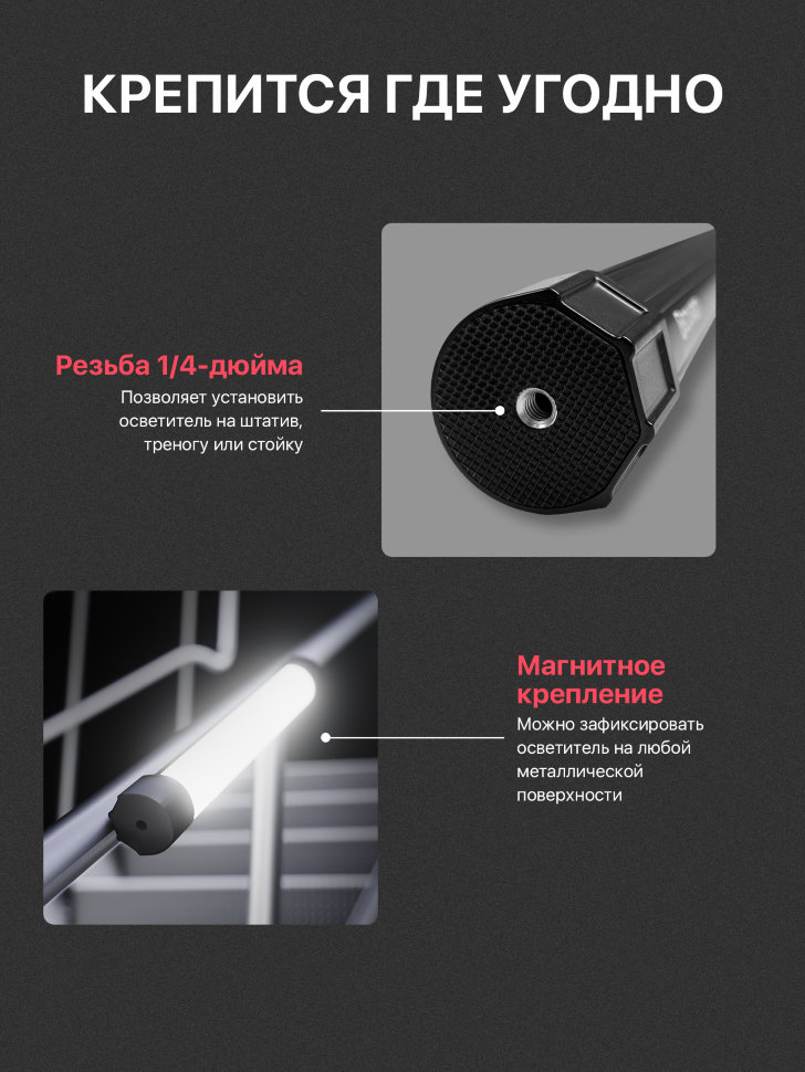 Крепится где угодноНе зависимо от размера, REQUIRED Trees комплектуются магнитными креплениями, позволяя зафиксировать осветитель на любой металлической поверхности. Кроме того, на всех устройствах имеются 1/4-дюймовые резьбовые отверстия, позволяющие установить осветитель на штатив, треногу или стойку |