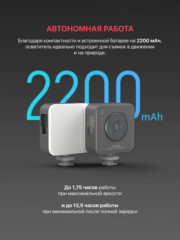 Полная гибкость освещенияLED панель предлагает гибкость управления яркостью (от 0 до 100%) и температурой света (от теплых 2700K до холодных 6500K), что позволяет легко адаптироваться под любые условия съемки. Независимо от того, снимаете ли вы на улице при естественном свете или в помещении с искусственным освещением, этот светильник поможет создать нужную атмосферу. Благодаря компактности и встроенной батарее на 2200 мАч, P96 идеально подходит для съемок в движении и на природе  |