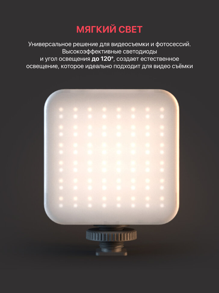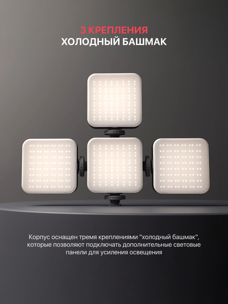Простота использования и расширение возможностейКорпус оснащен тремя креплениями "холодный башмак", которые позволяют подключать дополнительные световые панели для усиления освещения. Универсальный адаптер с 1/4" резьбовым отверстием делает его совместимым с DSLR-камерами, штативами и стойками. Это делает P96 отличным выбором для блогеров, видеографов и тех, кто создает контент для социальных сетей, гарантируя профессиональное качество освещения в любых условиях съемки  |