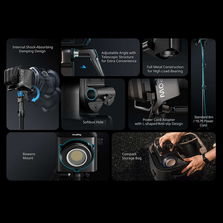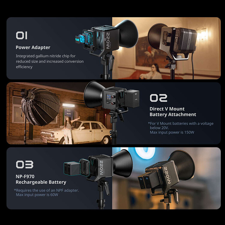 Гибкость питания и автономностьСветильник поддерживает три варианта питания: от адаптера, V-mount батарей или аккумуляторов NP-F970 (через переходник NP-F). Такая универсальность позволяет использовать RC 220 Pro в студийных и полевых условиях без ограничений по энергоснабжению, обеспечивая мобильность и независимость от розетки  |