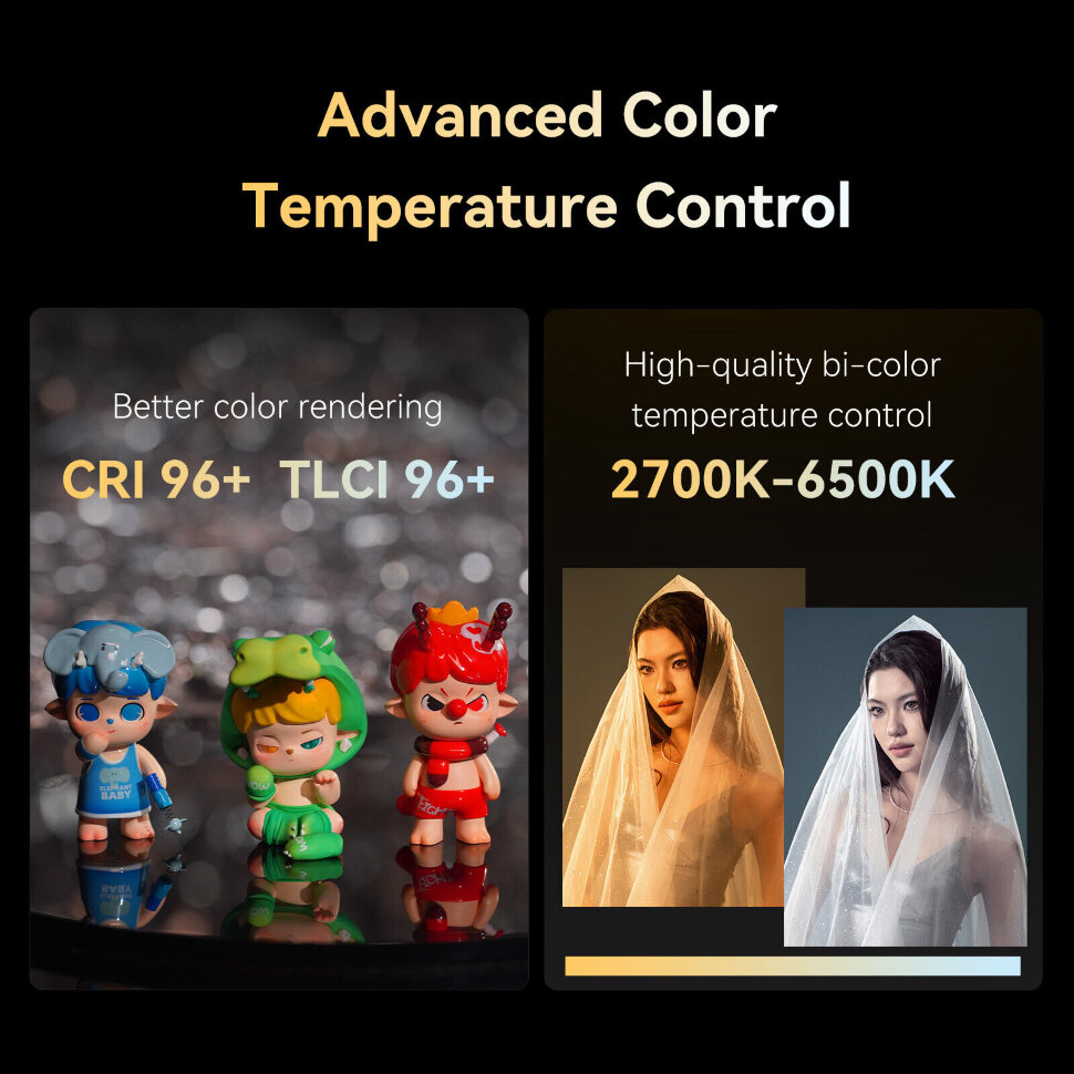 Профессиональный светЦветовая температура имеет широкий диапазон 2700K - 6500 K, а высокие показатели цветопередачи обеспечат естественные оттенки в кадре. При 5600 К и 15°, осветитель способен обеспечить 43400 lux при 0.5м. Предусмотрена встроенная память для сохранения настроек, что ускоряет подготовку к работе  |