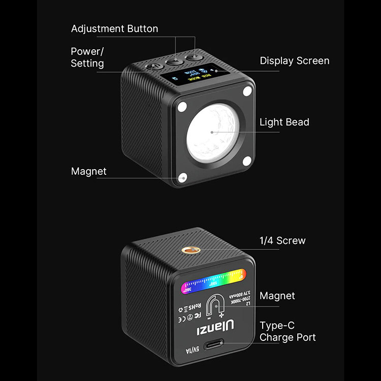 Функционирует осветитель от аккумуляторной батареи емкостью 800 мАч. Это обеспечивает ему не менее 65 минут непрерывной работы. Зарядка производится через интерфейс Type-C. Наличие дисплея значительно упрощает настройку светильника для конкретной сцены  |