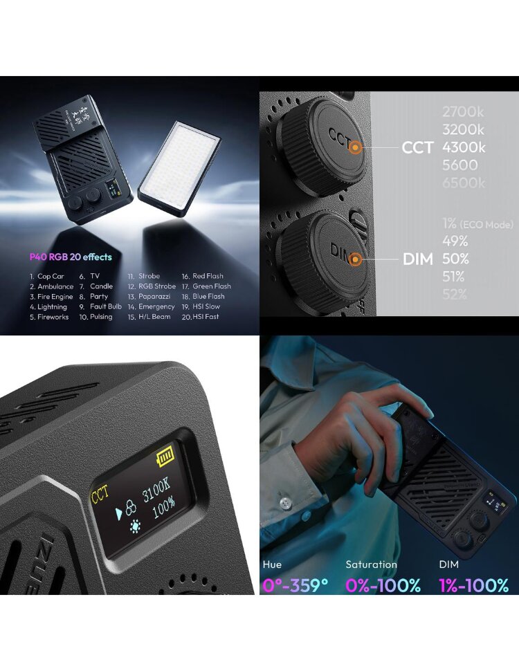 Мощный и автономный источник светаПортативный видеосвет мощностью 40 Вт, обеспечивающей равномерное освещение профессионального уровня. На расстоянии 0.3м он способен выдать целых 14000люкс (6500K@100%). Прочная и лёгкая конструкция станет отличным решением для выездных съёмок, а также он подойдет для проведения стрима, макросъёмки и блогинга. Модель выпущена в двух модификациях: