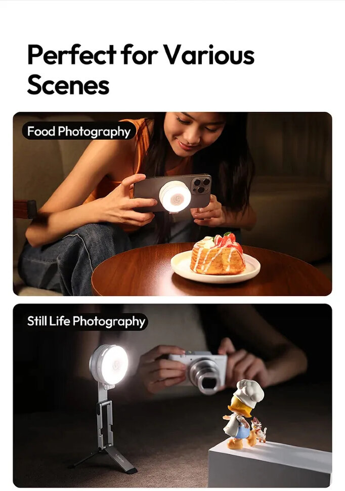 Универсальность и эргономикаМагнитная система крепления обеспечивает поворот на 360°, а конструкция имеет наклон на 180° для точного позиционирования. Вес устройства всего 90 грамм, а компактные габариты в сложенном положении позволяют положить LM23 Gen 2 в сумочку или карман. Заркепить его можно на смартфон или чехол с магнитом MagSafe, а также он совместим с держателями экосистемы MagLock от Ulanzi |