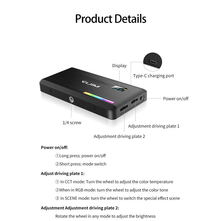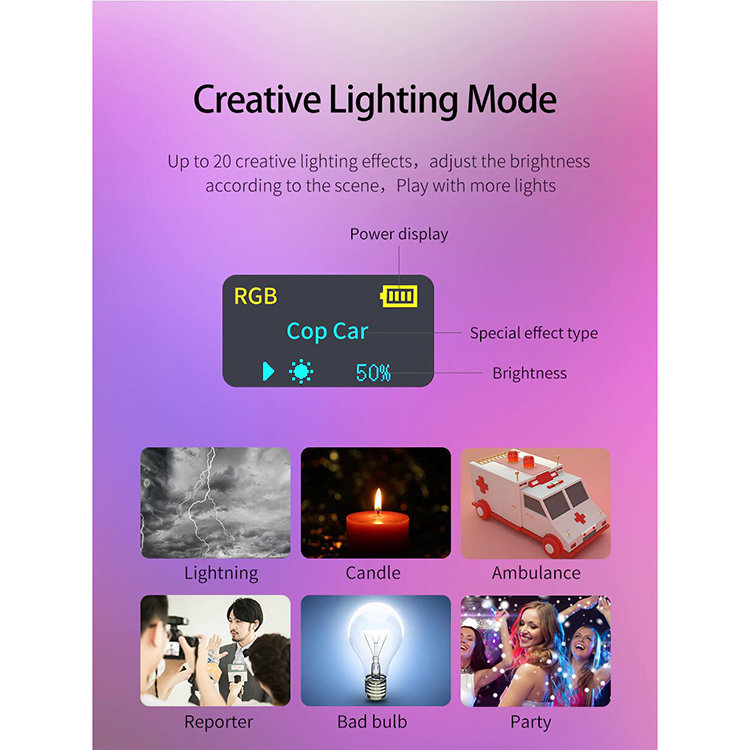 VL196 имеет регулируемую цветовую температуру от теплых 2500К до холодных 9000К, а также RGB режим с возможностью выбрать практически любой оттенок освещения. 20 встроенных цветовых эффектов помогут получить креативное освещение на видео |