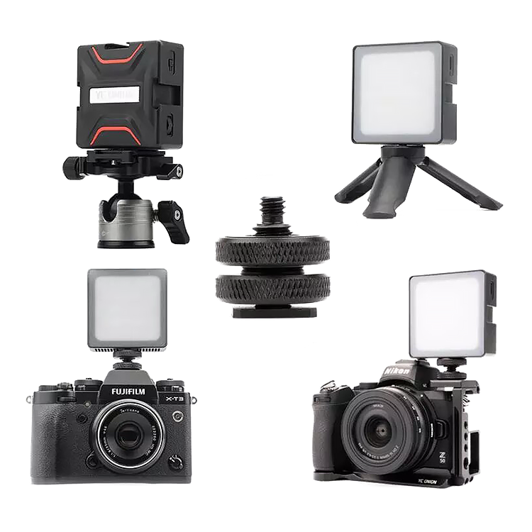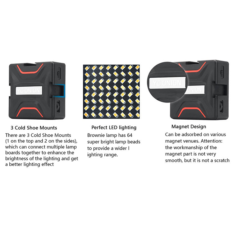 Простой и удобный монтажYC Onion Brownie LED RGB может быть установлен на клетку, камеру, штатив и любое другое оборудование. Представленная модель имеет 3 крепления на холодный башмак, него можно с легкостью закрепить микрофон и другие дополнительные аксессуары, либо собрать LED панель из нескольих приборов этой модели |