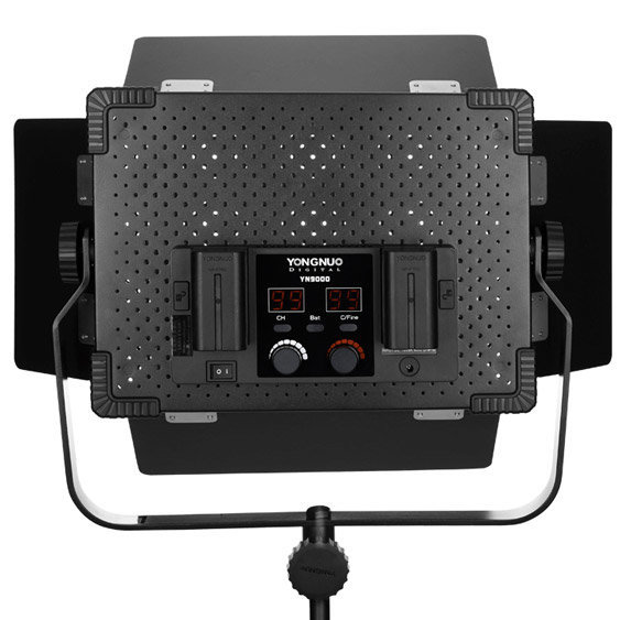 YN9000 выполнен из высокопрочного алюминиевого сплава. Оснащен дополнительно шторками для улучшения эффекта рассеивания и обеспечения большого угла освещения. Осветительное устройство может функционировать как от сетевого адаптера, так и от двух аккумуляторных батарей NP-F970. Управлять можно при помощи кнопок на задней панели и удаленно используя пульт или приложение. С мобильного устройства можно регулировать интенсивность света |