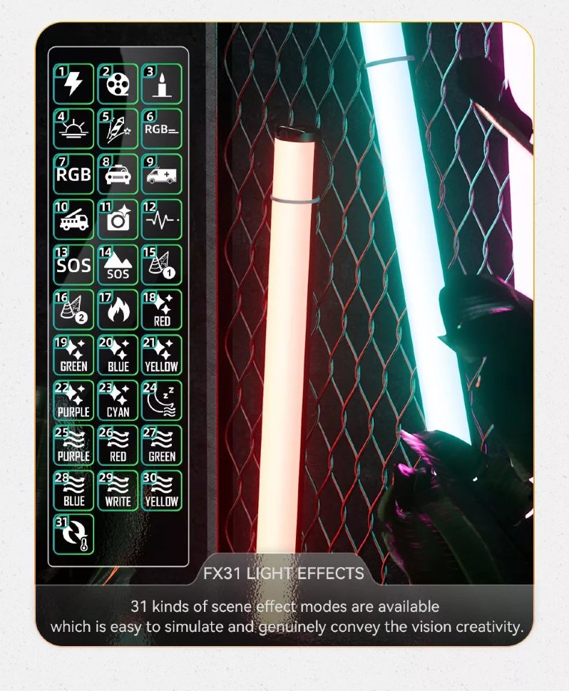 31 FX режимОсветитель уже имеет на борту 31 встроенный эффект художественного освещения. Вы сможете имитировать вспышки папарацци, сирену полицейской или пожарной машины и даже светомузыку на вечеринке! Настроить параметры можно как на панели управления встроенной в корпус, так и через мобильное приложение |