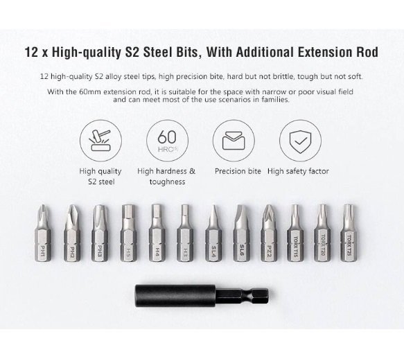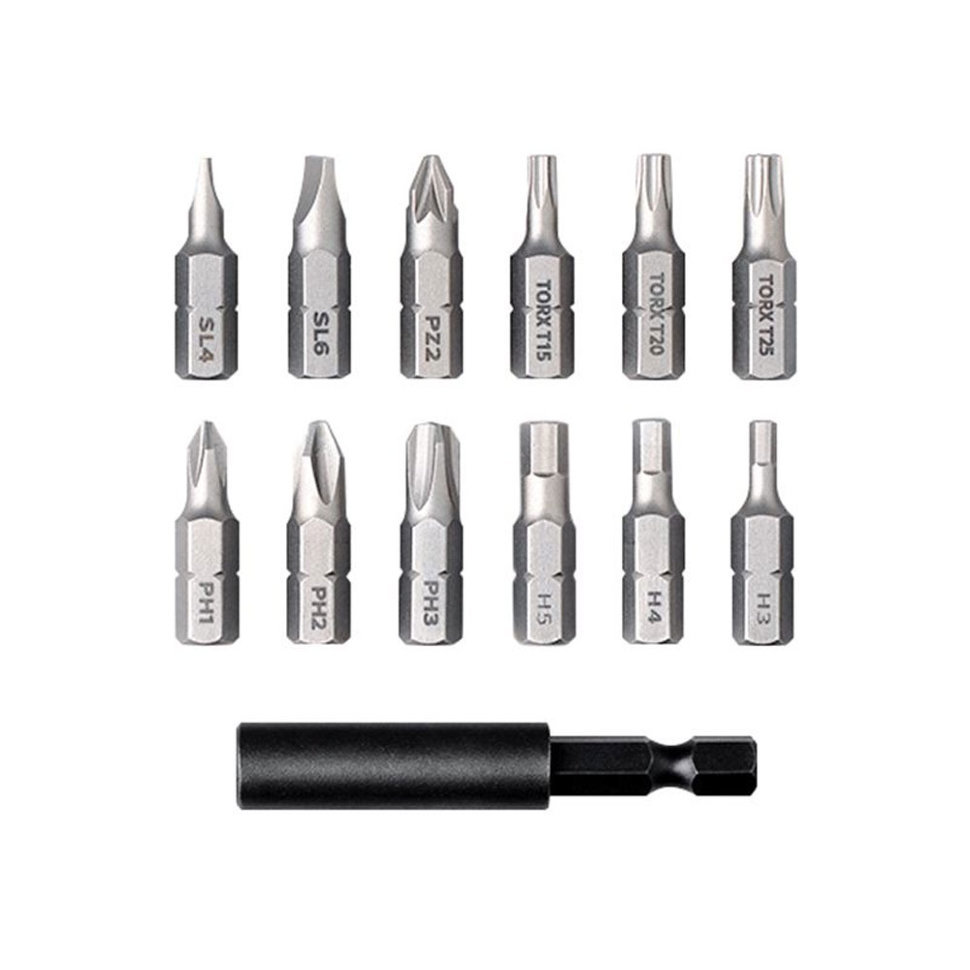 Впечатляющая комплектацияВ комплектацию шуруповёрт входит удлинительная планка на 6 см и универсальный набор бит, изготовленных из легированной стали. Среди них: крестовые PH1/PH2/PH3 и PZ2, шестигранные H3/H4/H5, шлицевые (плоские) SL4/SL6, TORX T15/T20/T25. Биты крепятся к шуруповёрт с помощью встроенного магнита. Все насадки невероятно прочные и обладают антикоррозийными свойствами |