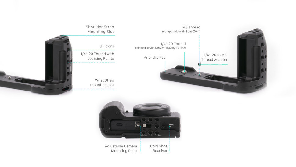 Базовая площадка для Sony ZV-1, ZV-1F и ZV-1M2 для более комфортной и жффективной работы с камерой. Имеет несколько отверстий под винт 1/4" для установки дополнительных креплений и аксессуаров |