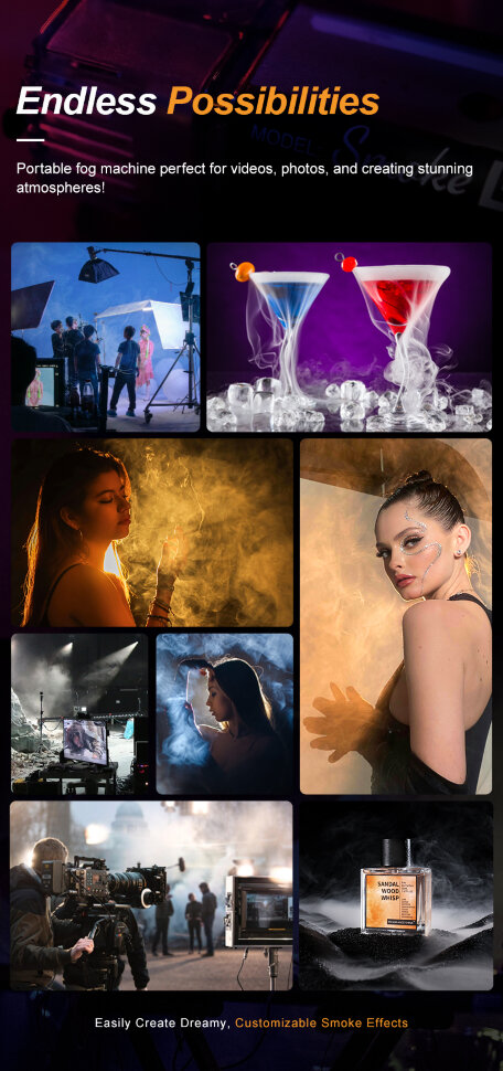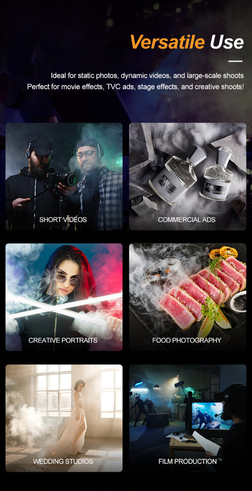 Универсальность примененияГенератор выдаёт до 20 кубометров дыма за 1 минуту, позволяя быстро наполнить пространство для креативной съёмки и впечатляющих мероприятий. Прекрасное решение для концертов, свадеб, тематических вечеринок и фотосессий. Благодаря стандартному штативному креплению 1/4" на дне, его можно закрепить в студии. Встроенного аккумулятора хватит на 25 минут работы |