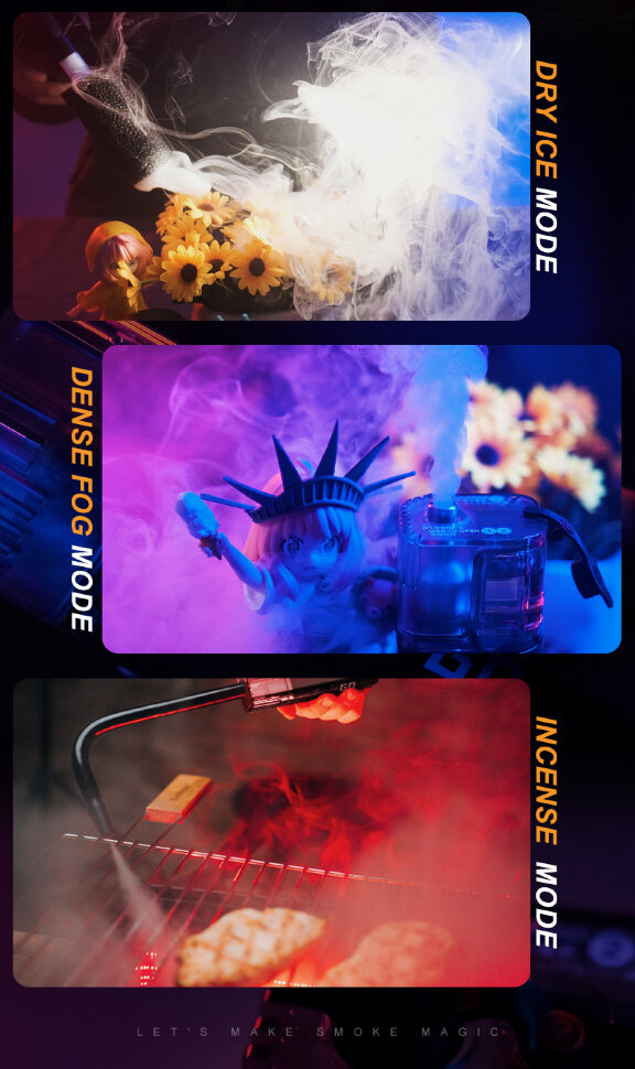 Управление и режимы работыИнфракрасный пульт дистанционного управления (до 10 м) регулирует интенсивность и продолжительность дымообразования. Поддерживает 5 режимов: портрет, эффект сухого льда, кинематографическая дымка, режим благовоний и ручное управление. Благодаря насадкам добавленным в комплект, вы сможете направлять или рассеивать поток дыма для нужного эффекта |