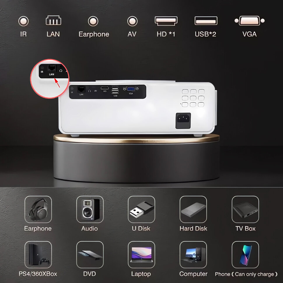 TouYinger Q10W Max оснащен различными разъемами, включая USB, HDMI, VGA, LAN, AV и аудиовыход 3.5 мм. Это обеспечивает широкие возможности подключения различных устройств. Он крайне компактный, а вес - всего 2.5 кг. Это делает данную модель компактной и удобной для переноски и использования в разных местах и помещениях |