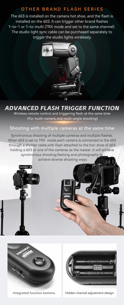 Система обеспечивает беспроводную синхронизацию вспышки и камеры на расстоянии до 100 метров с устойчивым сигналом даже в условиях электромагнитных помех. Технология 2.4 ГГц позволяет передавать команды без ограничения по направлению, а скрытая регулировка каналов (до 16 независимых групп) исключает пересечение сигналов при групповой работе. Совместимость с импульсными приборами Yongnuo YN560 и сторонними вспышками через горячий башмак делает систему гибкой для любых сценариев |