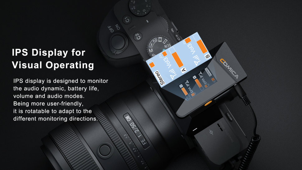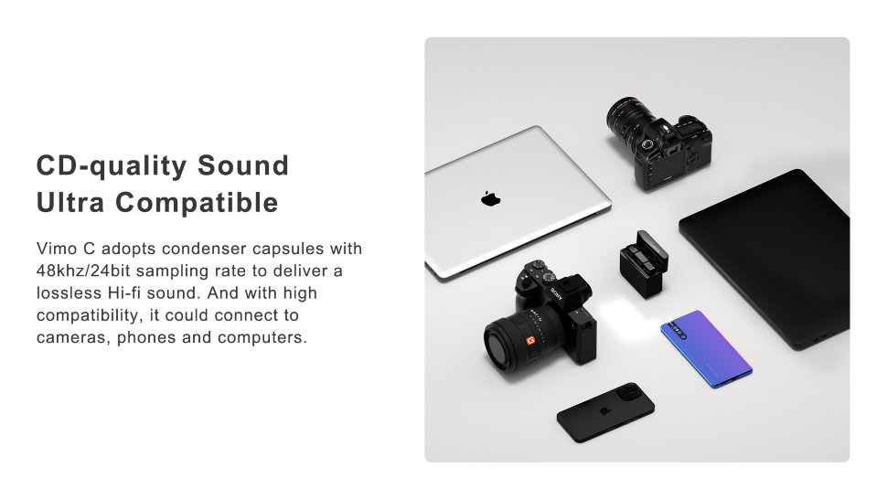 Миниатюрная радиосистема Vimo C — совместима с широким спектром устройств, включая смартфоны, камеры и рекордеры с входными разъёмом 3,5 мм. В дополнение к стандартному монофоническому режиму, она также предлагает стереофонический режим и звуковую дорожку безопасности |