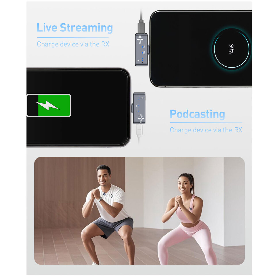Эргономика и автономностьМиниатюрные передатчики весом 9 грамм оснащены универсальным креплением для незаметной фиксации на одежде. Система обеспечивает до 5.5 часов непрерывной работы от одного заряда передатчика (TX) и приемника (RX), а зарядный чехол емкостью 1000 мАч сможет подзарядить комплект 2.5 раза |