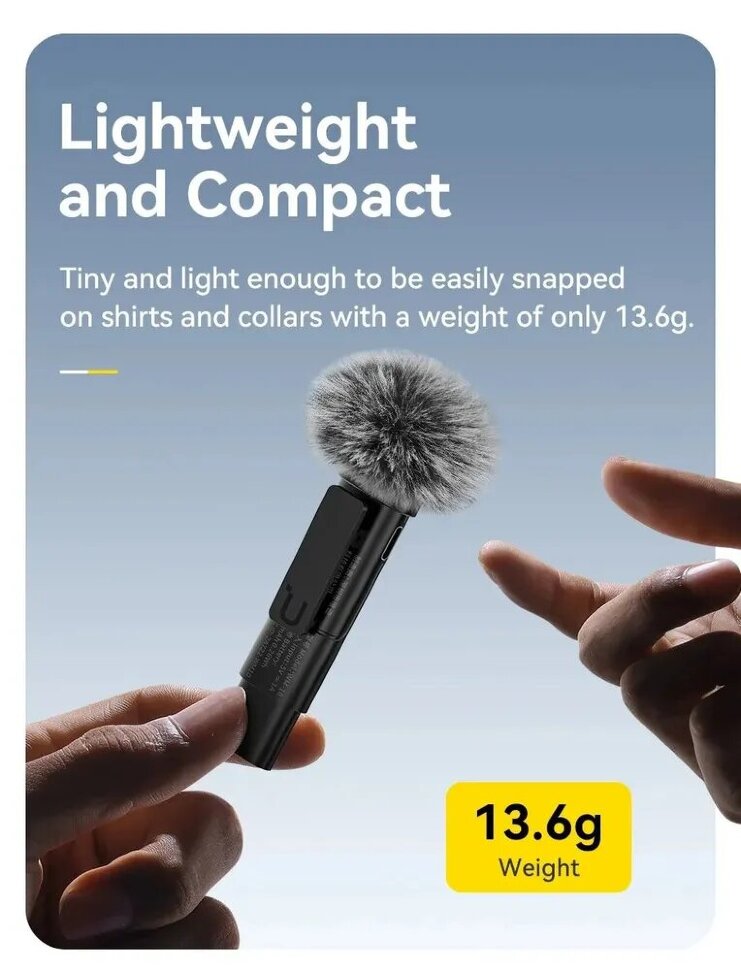 Передатчик оснащен всенаправленным конденсаторным капсюлем, который обеспечивает четкую и детализированную запись звука с различных направлений. Встроенный аккумулятор обеспечивает до 4.5ч работы, что позволяет использовать микрофон на протяжении всего дня без необходимости подзарядки. Дальность действия беспроводного соединения достигает 10 метров, что предоставляет свободу движения при записи |