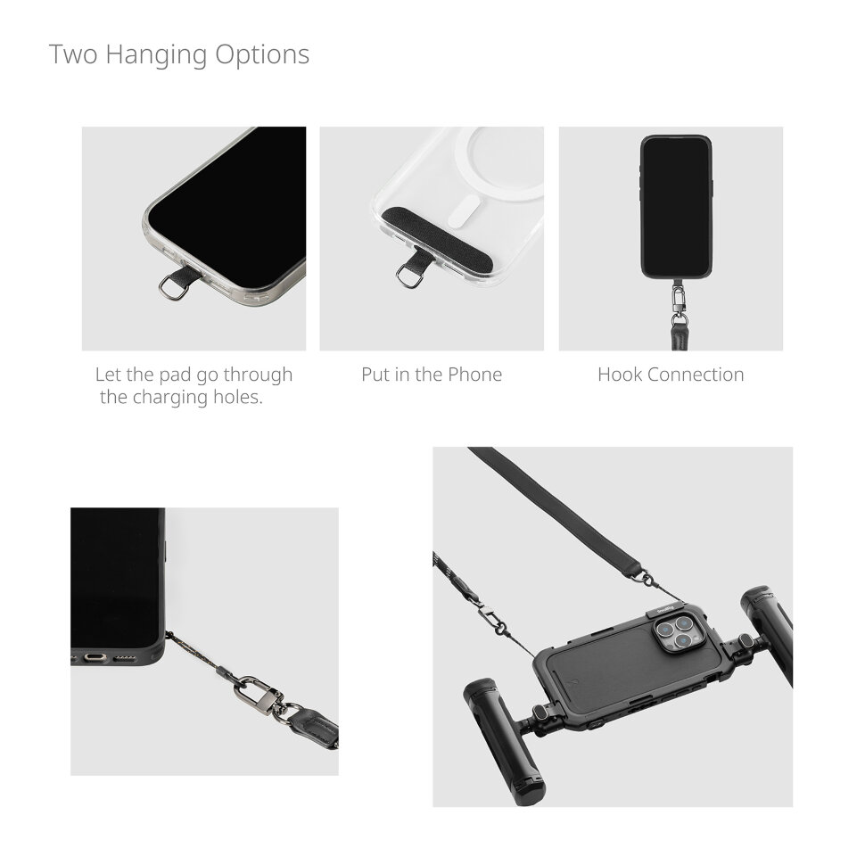 Шейный ремешок SmallRig FilMov из натуральной кожи и нейлонового шнура с регулируемой длиной (система перуанского узла) поддерживает ношение на шее или через плечо. Комплектация включает два шнурка для мобильной клетки, а также вставку для чехла, что не блокирует зарядный порт. Металлический карабин внизу позволяет фиксировать аксессуары (AirPods, ключи), а многофункциональная петля расширяет варианты подвеса. Рекомендовано избегать контакта с агрессивными химикатами, интенсивных нагрузок и развязывания узла