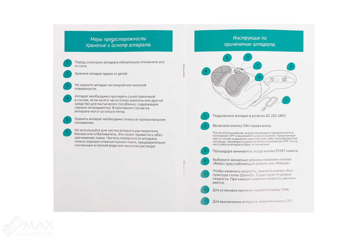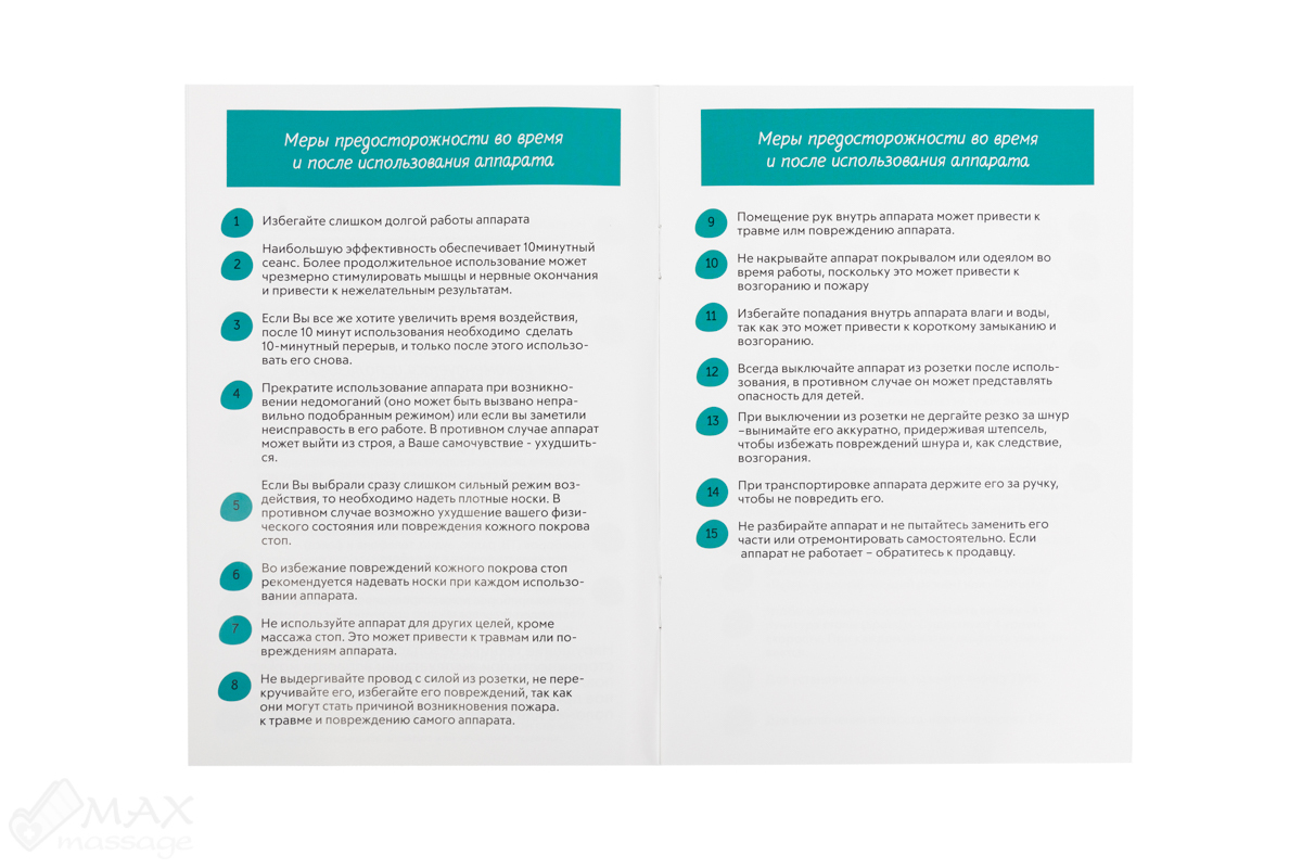 Если Ваш размер ноги меньше 35 или больше 46, использовать аппарат не рекомендуется! Перед использованием аппарата внимательно прочтите инструкцию и соблюдайте все предосторожности. Не помещайте внутрь массажёра руки, не допускайте попадания влаги и не пытайтесь самостоятельно разобрать его при поломках и неисправностях. Производитель и дистрибьютор не несут ответственности за поломки или травмы, возникшие при неправильном применении устройства. |