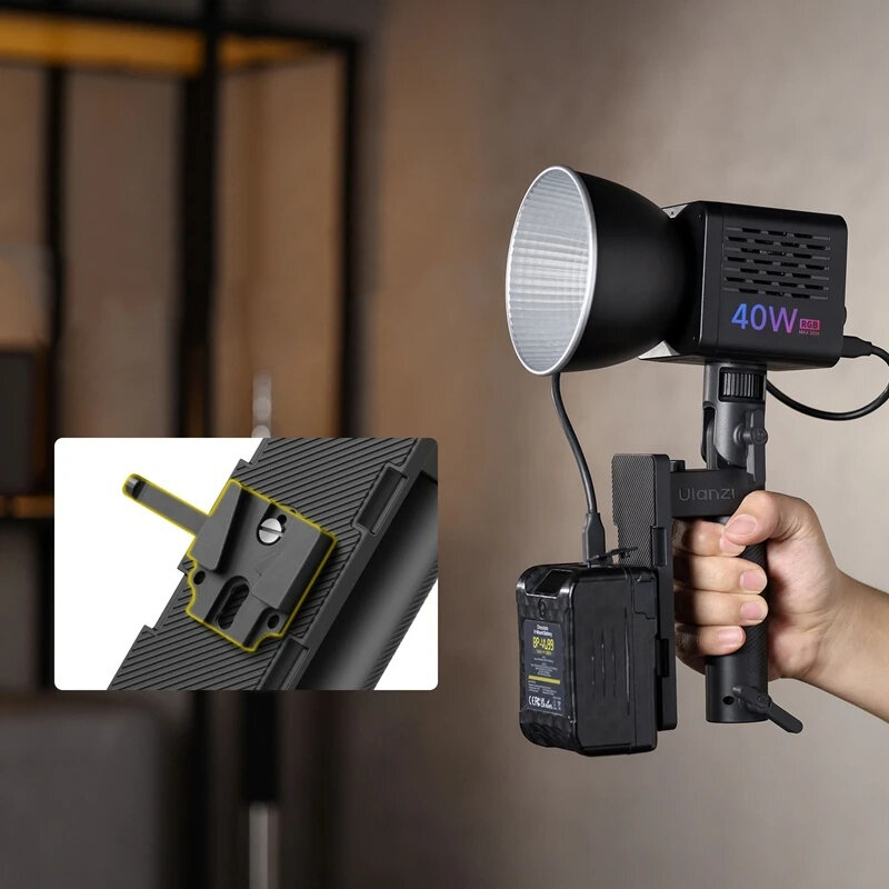 Специальная рукоятка разработана для обеспечения мобильности при работе с портативным осветителем. В верхней части расположен винт ARRI 1/4" с возможностью регулировать угол наклона, а снизу адаптер для стойки 5/8". Специальный держатель для аккумулятора открывает возможность подключения автономного питания, а ремни обеспечат надежное крепление |