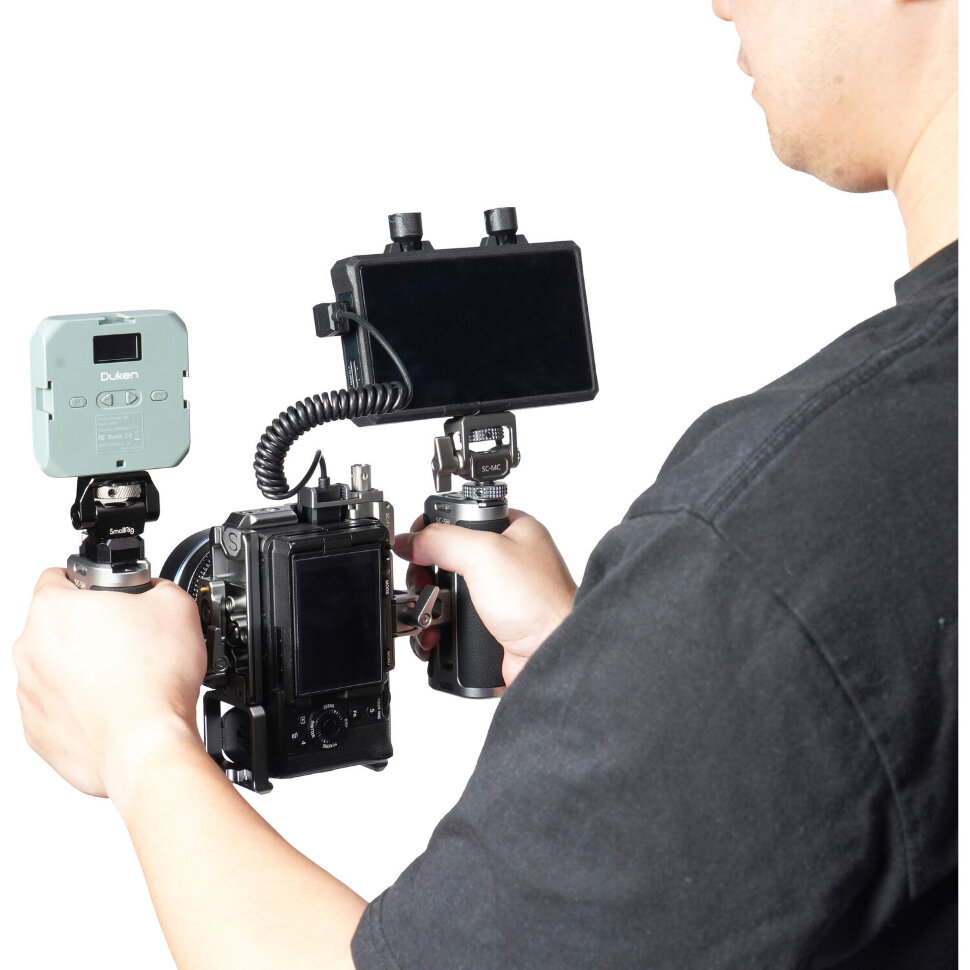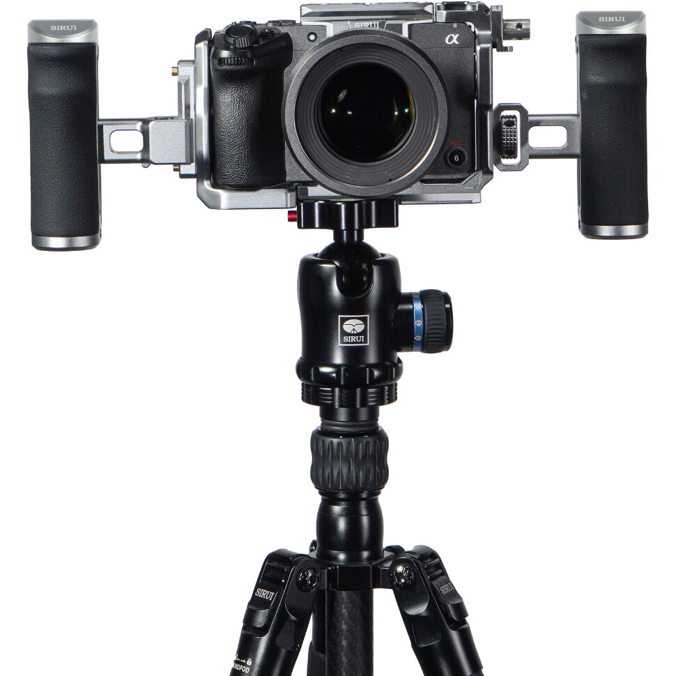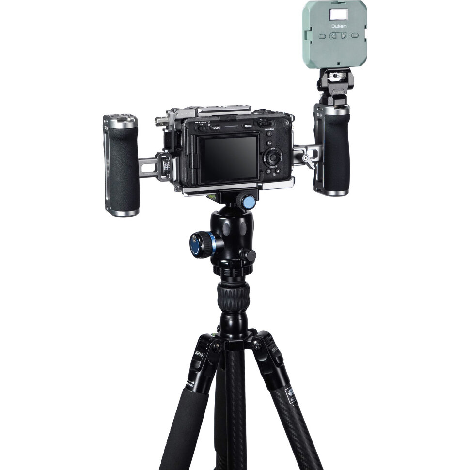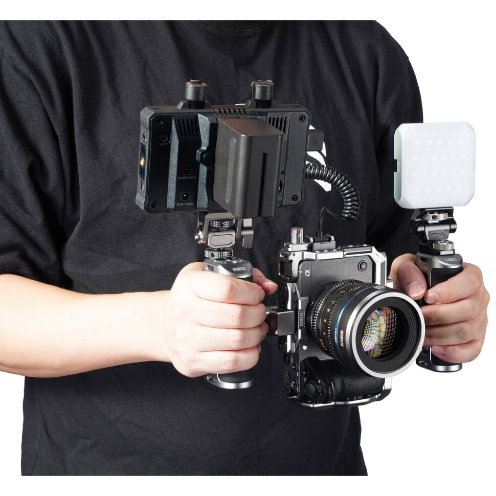 В верхней части предусмотрены отверстия 1/4" и 3/8", а также холодный башмак, чтобы установить свет, микрофон, монитор, монтажный кронштейн или другой аксессуар. Мягкая силиконовая рукоятка обеспечивает удобное, противоскользящее крепление, а внутри хранится магнитный шестигранный ключ для регулировки |