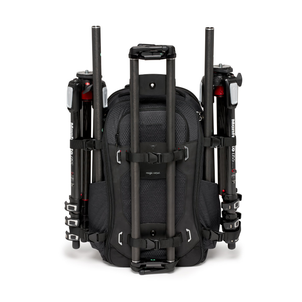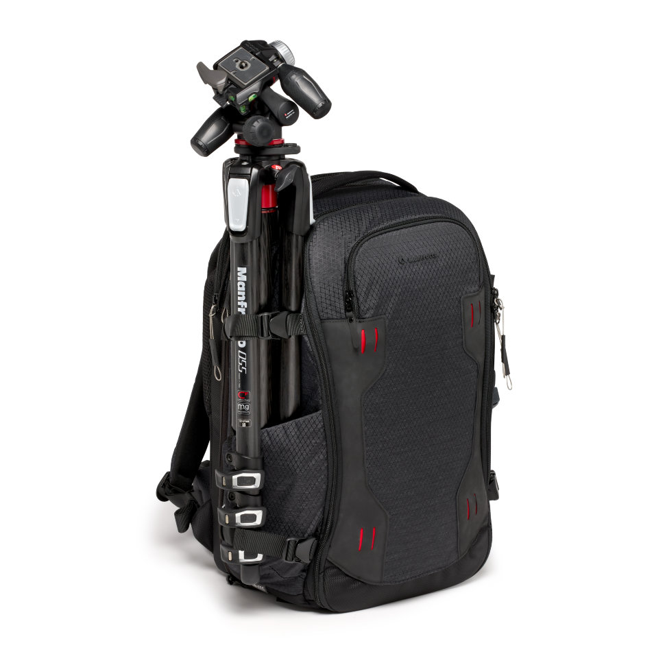 Функционал расширяют несколько точек внешнего крепления с возможностью размещения оборудования в различных конфигурациях: имеются две фиксированные точки крепления с обоих боков рюкзака и два ремня с передней стороны, что позволит закрепить одновременно, например, 2 штатива и слайдер |
