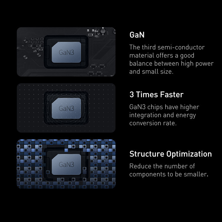 Технология GaN3 ProИспользование полупроводникового материала нитрида галлия гарантирует высокую теплопроводность, термостойкость, радиационную стойкость, кислотостойкость, а также прочность и долговечность. Это делает адаптер очень мощным, но при этом компактным и способным заряжать 4 разных устройства |