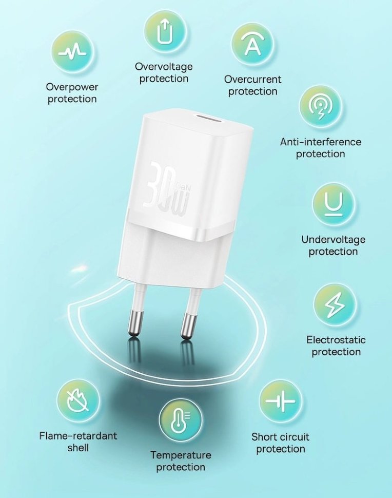 Встроенная система защиты от перегрева и перезарядки защитит заряжаемый гаджет от возможных повреждений, а также вы можете не бояться скачков напряжения при нестабильной работе сети |
