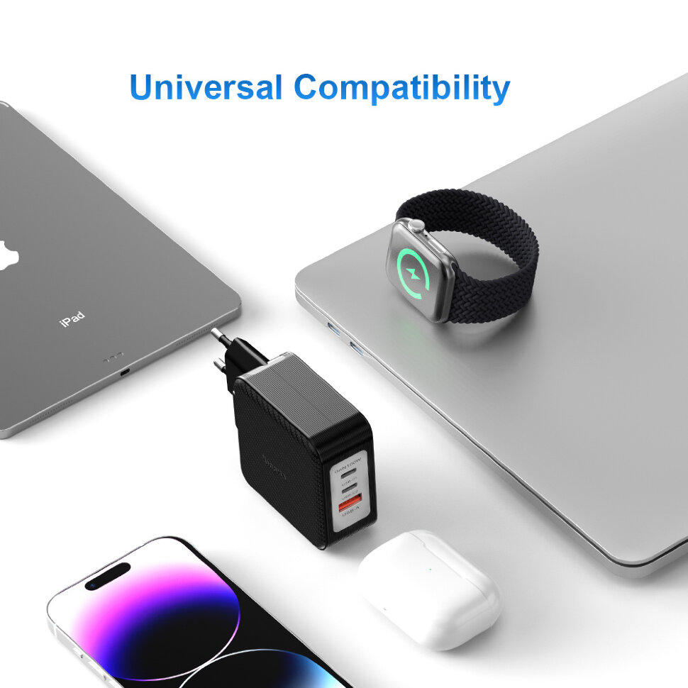 Мощь и компактностьGaN-технология делает этот адаптер невероятно компактным при мощности 100 Вт, способной заряжать ноутбуки, смартфоны и планшеты. С портами Type-C PD 3.0 (до 20V/5A) и двумя USB (до 12V/1.5A) он одновременно питает несколько устройств, поддерживая протоколы быстрой зарядки. Универсальный вход 100-240В подходит для путешествий, а защита от перегрузок, короткого замыкания и перегрева гарантирует безопасность. Вес всего 220 г и огнестойкий корпус из поликарбоната превращают его в идеального спутника для работы в любых условиях |