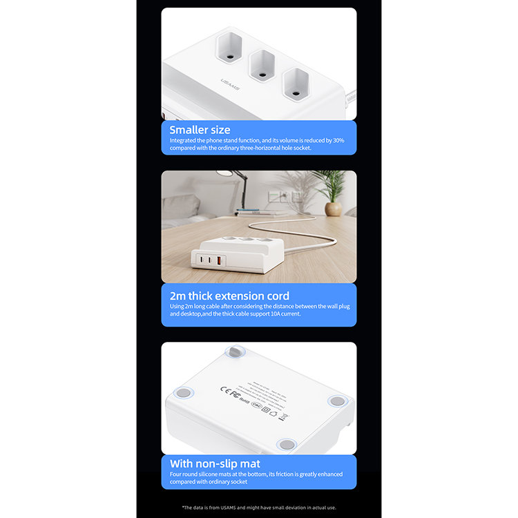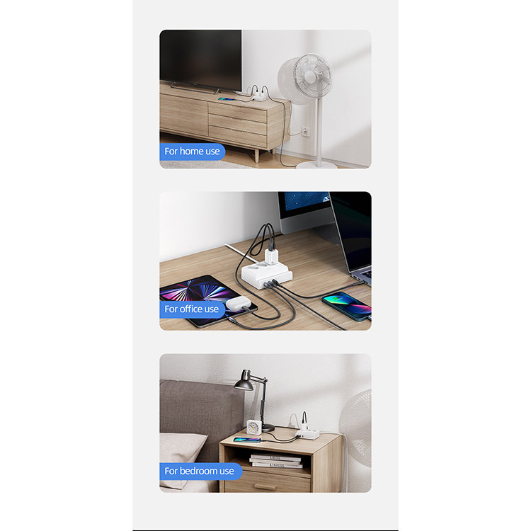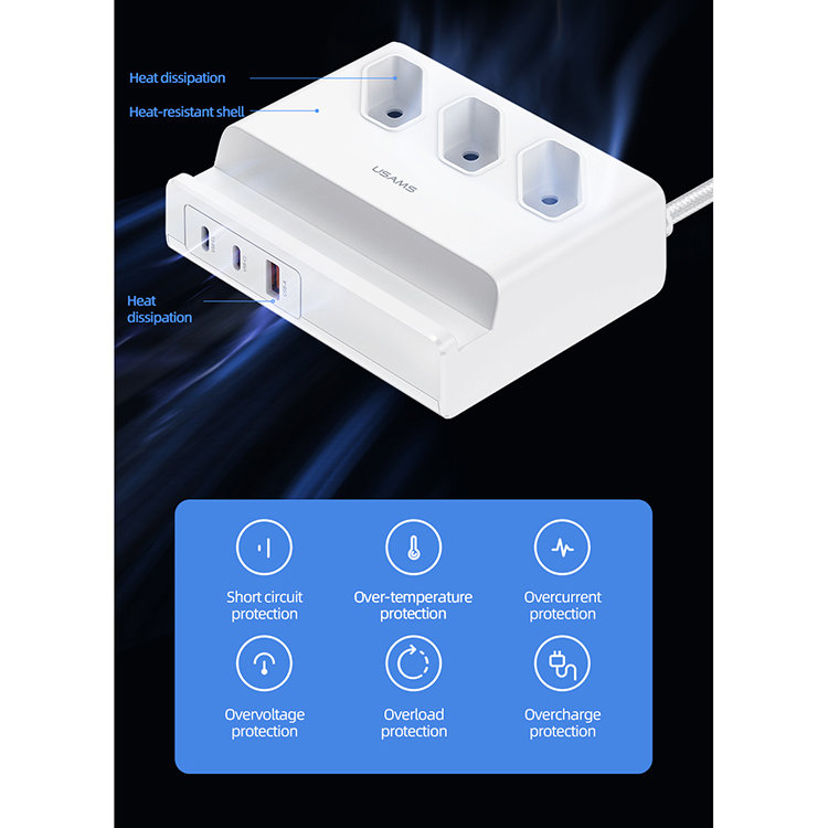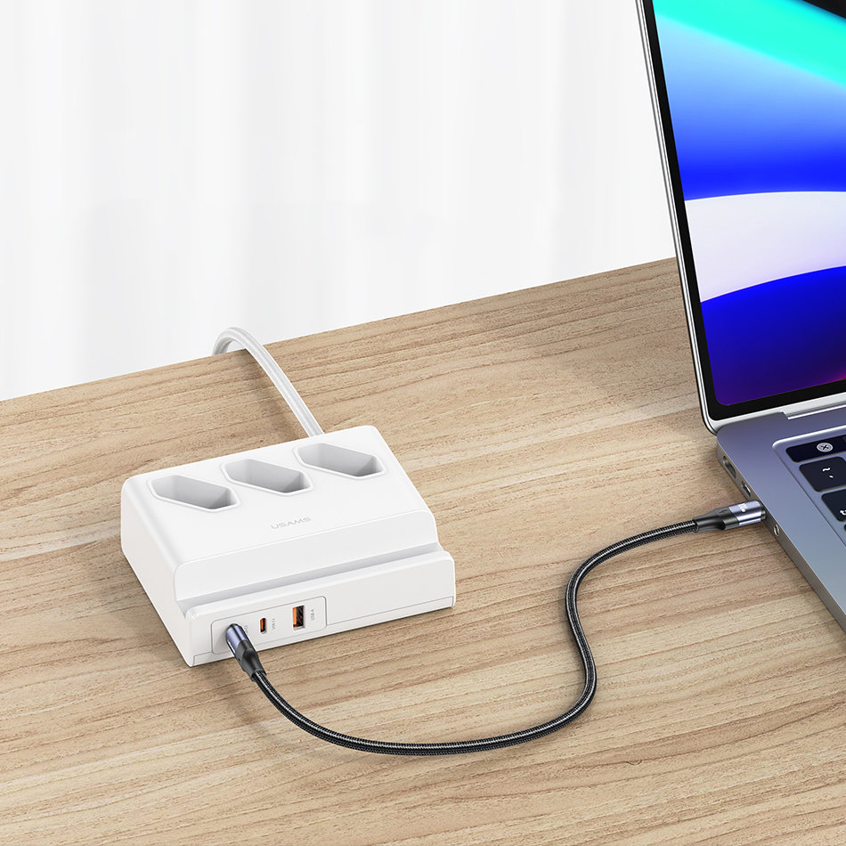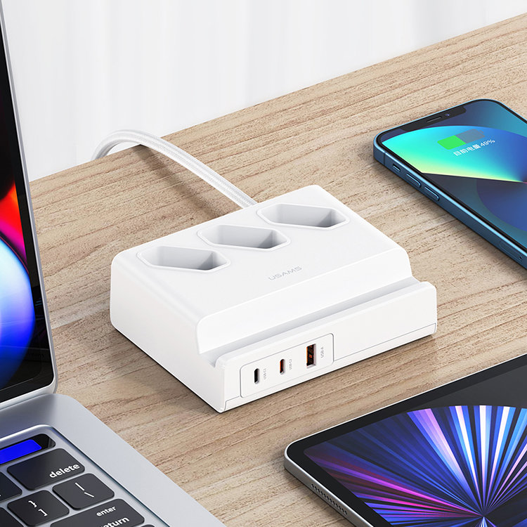 Умный удлинитель с тремя розетками, двумя Type-C и одинм скоростным USB портом. Поддерживает быструю зарядку Power Delivery и Quick Charge. С его помощью можно наилучшим образом организовать рабочий стол, избавиться от лишних проводов и повысить скорость зарядки |