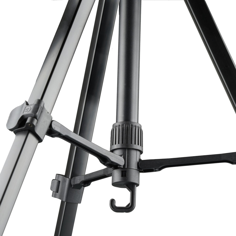 Быстрая установка и надежная фиксацияНа колонне расположен крючок для подвески груза, который придаст штативу дополнительную устойчивость. Цанговый замок на центральной колоне позволяет регулировать угол наклона ног, что особенно полезно в ограниченном пространстве. Эргономичные клипсы замков секций ножек обеспечивают быструю и удобную установку и складывание штатива |