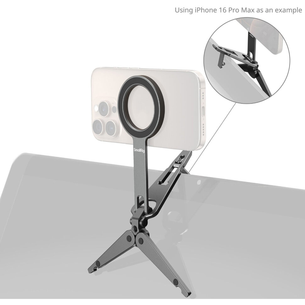 Универсальный магнитный штатив для современных задачКомпактный многофункциональный штатив с магнитным креплением MagSafe для установки смартфона. С его помощью видеосъёмка или общение онлайн станет удобнее и функциональнее. Держатель может быть наклонен под нужным углом в диапазоне до 270°, а задняя ножка с крючком Mantis позволяет повесить его на монитор, край стола или решетку для съёмки с высокого ракурса |